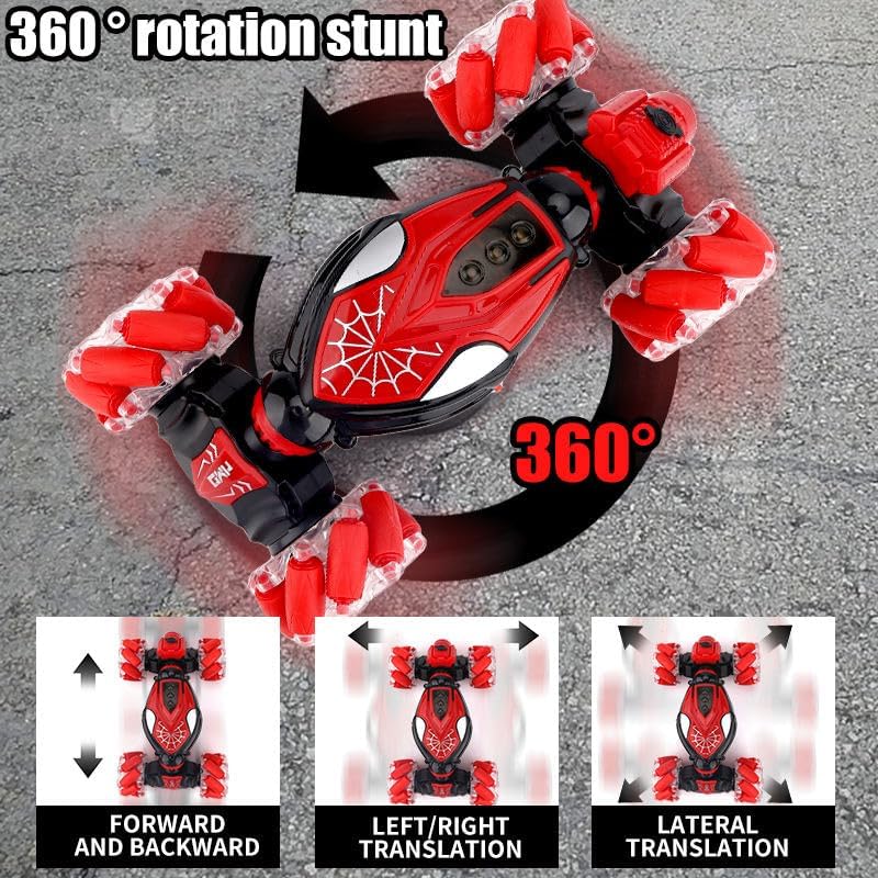 Gesture Sensing RC Stunt Car with LED Lights, 360° Spins, Remote Control, Spider Theme, Ages 3+